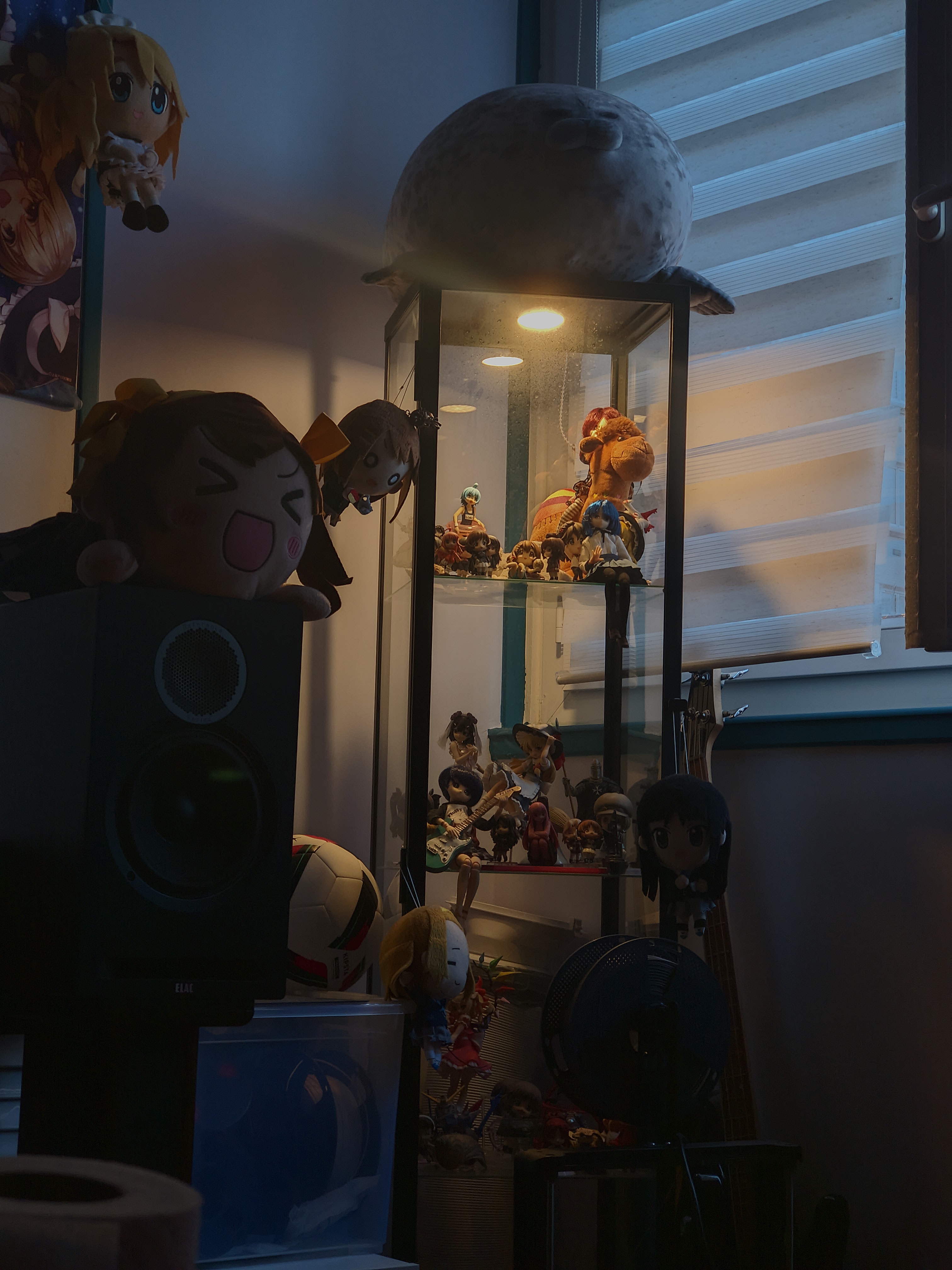 A strange stillness envelops the room. Phares dans la nuit, soft floodlights atop the glass cabinet cast their warm glow upon the dolls and figs sitting on its shelves, gentle enough to welcome your gaze even as you stare directly at them, with that sort-of banding effect around, you know? Each concentric circle gets a little dimmer until you can't really see the light itself anymore, only what it lits up and brings relief to.